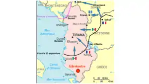 In Albania, the Austro-Hungarian XIX Corps under Karl von Pflanzer-Baltin withdrew by land to avoid encirclement. The Entente had firm control of the Adriatic Sea, as shown by the Allied bombing of Durrës on 2 October. The Italian 16th Army corps (CSIO) and the French 57th division advanced northward, liberating Berat on 1 October, Durrës on 16 October, and Shkodër on 30 October. From the east the French 11th Colonial Division, 30th Division, Italian 35th Division and Greek 3rd and 4th Divisions entered Albania, liberating Elbasan on 8 October. Having reached Kotor, Austro-Hungarian forces surrendered on 3 November.[5]