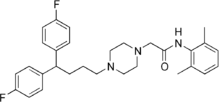 Lidoflazine is a piperazine calcium channel blocker. It is a coronary vasodilator with some antiarrhythmic action.[1] Lidoflazine was discovered at Janssen Pharmaceutica in 1964.