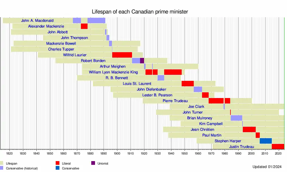 This is a graphical lifespan timeline of prime ministers of Canada. Twenty-three people have served as Prime Minister of Canada since the office came into existence in 1867. They are listed in order of office. (Prime ministers leading multiple ministries are listed in the order of their first premiership).