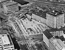 The Lilla Bommen building was a part of a city initiative in the 1980s aimed at restoring the connection to the cities central waterfront, the Göta Canal. The city proposals sought to create a balanced central square that provided both functional areas for shops and offices, and open public places that created cohesion to the waterfronts of the city that had been lost by prior existing infrastructure.[5] The Lilla Bommen building stands distinctive from Sweden’s ‘groundscraper’ traditional office buildings, which became popularised in urban and suburban areas of Sweden’s cities owing to the lack of space constraints of the areas.[6]
