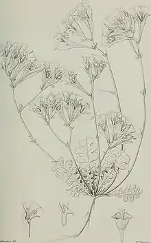 Limonium bonduellei, the yellow statice (a name it shares with Limonium sinuatum), is a species of flowering plant in the family Plumbaginaceae.[2] The Global Biodiversity Information Facility calls it Algerian statice and lists it as Limonium sinuatum subsp. bonduellei, but a 2018 molecular study showed that it is good species with 100% bootstrap support.[3][4] An annual facultative halophyte reaching 50 cm (20 in), it is native to Spain and North Africa, and has been introduced to Italy.[5][1] It is naturalized in New Zealand.[2]