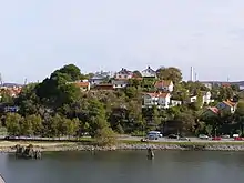 Lindholmen Castle (Swedish: Borgen Lindholmen) was a medieval castle on the former island of Lindholmen, which is now part of the larger island of Hisingen and lies within the urban area of modern Gothenburg. The castle stood on a rocky outcrop, which is still known as Slottsberget ("The Castle Hill"), overlooking the Göta Älv. This was an area of immense strategic significance in the Middle Ages, as at that time Hisingen straddled the Norwegian-Swedish border, and the mouth of the Göta Älv was Sweden's sole point of access to the North Sea.