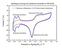 Comparison of the current response of a platinum disc electrode in 1 M sulphuric acid given by linear sweep cyclic voltammetry and staircase cyclic voltammetry methods. Staircase voltammetry suppresses the non-faradaic adsorption of hydrogen.