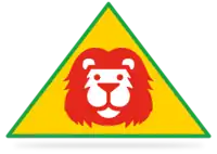 It represents a red and white lion face in a triangle with a yellow background and green borders.[1]