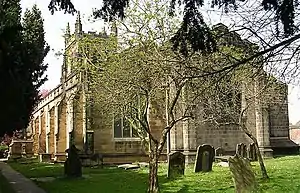 He was taken prisoner by Yorkist forces at the Battle of Blore Heath on 23 September 1459. In 1461 he was with the army of Queen Margaret, which advanced on London, and won the Second Battle of St Albans on 17 February 1461. He was slain a month later at the Battle of Towton on 29 March 1461, though rumours of his survival ran about.[6] After his death he was attained by Act of Parliament on 21 December 1461, whereby all his honours were forfeited. He was buried with his first wife, Joan Waterton, in the Waterton Chapel in St Oswald's parish church at Methley, Yorkshire,[7][2][8] where they have a fine table-tomb monument with recumbent effigies.[9] Welles is shown in full armour with a lion at his feet.
