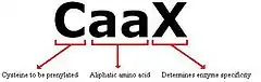 The prenylation motif “CaaX box” is the most common prenylation site in proteins, that is, the site where farnesyl or geranylgeranyl covalently attach.[2][3] In the CaaX box sequence, the C represents the cysteine that is prenylated, the A represents any aliphatic amino acid and the X determines the type of prenylation that will occur. If the X is an Ala, Met, Ser or Gln the protein will be farnesylated via the farnesyltransferase enzyme and if the X is a Leu then the protein will be geranylgeranylated via the geranylgeranyltransferase I enzyme.[3][4] Both of these enzymes are similar with each containing two subunits.[7]