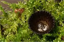 St Lucia, Trinidad, Guadelope, Jamaica, Mexico, Bolivia | 8–10 × 7–8 | Mouth of cup has stiff, dark setae 0.5–1 mm long; outside surface with fine appressed hairs and some longer tangled hairs; inside surface barely plicate, silvery; basal emplacement narrow (1.5–2 mm wide); epiphragm thin, white to pale buff; peridioles angular, black, shiny, 2.5 or more wide. | 17–24 × 10–14[40] |