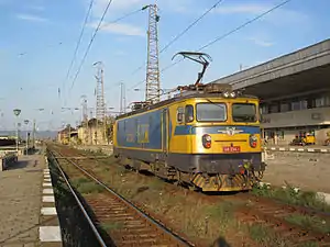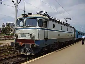 The electric locomotives employed by Romanian Railways-CFR and built by Electroputere Craiova are known as EA-type and were originally based on the license of the Swedish company ASEA.[21] All are built for standard gauge (1435 mm) and run using a catenary wire at 50 Hz 25 kV AC. Older electric locomotives are painted in grey livery, while modernised (post-1999) rolling stock use red livery.[22][23]