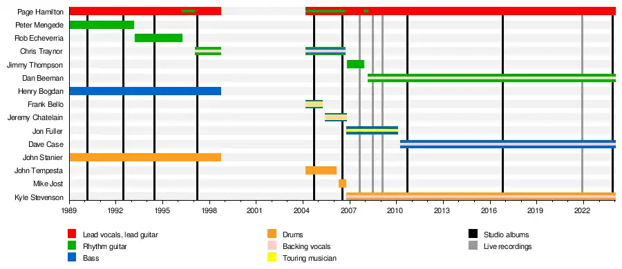In 2003, it was announced that Helmet had reformed with bassist Rob "Blasko" Nicholson and drummer John Tempesta joining Hamilton and Traynor.[6] A spokesperson for Hamilton later debunked the news, but noted that Hamilton and Traynor were working on an unidentified project.[7] In early 2004 the Helmet reformation was officially announced, with recently former Anthrax bassist Frank Bello and Tempesta joining the group.[8] Bello left to return to Anthrax in early 2005, with Jeremy Chatelain taking his place for remaining tour dates.[9] Tempesta left in early 2006 to join The Cult,[10] with Mike Jost taking his place a few months later.[11] In September, more lineup changes were announced as both Traynor and Jost left the group.[12] New additions Kyle Stevenson (drums) and Jon Fuller (bass) were announced the following month, which also marked Chatelain's departure.[13] Jimmy Thompson took Traynor's place later, although only remained with the band until late 2007 before being replaced by Dan Beeman the following February.[14]