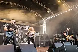 After a six-year absence, Holy Moses was reformed in late 2000 by Sabina Classen without Andy.[16] With guitarists Jörn Schubert and Franky Brotz, drummer Julien Schmidt, and founding member Jochen Fünders on bass, the band released the EP Master of Disaster in 2001, before Fünders left due to family commitments and was replaced by Andreas Libera.[15] The band's eighth full-length album Disorder of the Order followed in 2002, before Schubert was replaced by Michael Hankel in the summer.[17] By mid-2003, Libera had been replaced by Alex De Blanco.[18] The new lineup released Strength Power Will Passion in 2005, before De Blanco and Schmidt were replaced that summer by Robert "Ozzy" Freese and Asgard Niels, respectively.[19] Hankel also became the band's sole guitarist at the same time.[20]