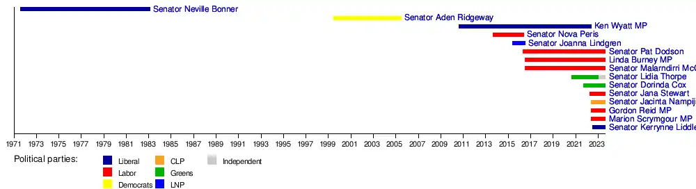 Kerrynne LiddleMarion ScrymgourGordon Reid (politician)Jacinta Nampijinpa PriceJana StewartDorinda CoxLidia ThorpeMalarndirri McCarthyLinda BurneyPat DodsonJoanna LindgrenNova PerisKen WyattAden RidgewayNeville Bonner