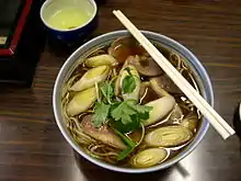 - Ramen (ラーメン): thin light yellow noodles served in hot chicken or pork broth with various toppings; of Chinese origin, it is a popular and common item in Japan. Also known as Shina-soba (支那そば) or Chūka-soba (中華そば) (both mean "Chinese-style soba").
