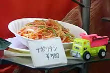 - with tomato ketchup, wieners, sliced onion and green pepper (called "naporitan" or "napolitan")