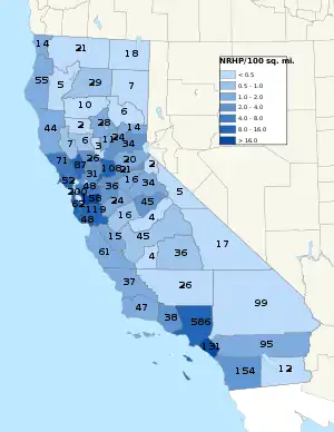 The following are approximate tallies of current listings in California on the National Register of Historic Places. These counts are based on entries in the National Register Information Database as of April 24, 2008,[1] and new weekly listings posted since then on the National Register of Historic Places web site.[2] There are frequent additions to the listings and occasional delistings and the counts here are not official. Also, the counts in this table exclude boundary increase and decrease listings which modify the area covered by an existing property or district and which carry a separate National Register reference number.