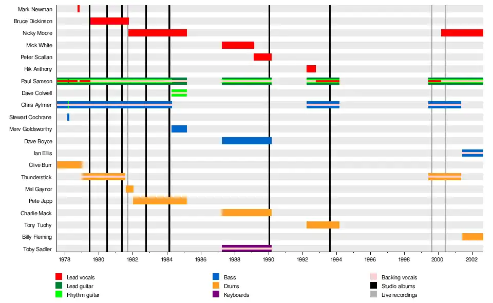 Shortly after the release of Survivors, Samson brought in Bruce Dickinson as their new frontman, who took on the stage name "Bruce Bruce".[6] Head On and Shock Tactics followed over the next two years, before Purkis left to form his own band Thunderstick in July 1981.[7] He was replaced by Mel Gaynor in time for Reading Festival the following month, which proved to be Dickinson's final show with Samson when he accepted an offer to join Iron Maiden in September.[8][9] He was soon replaced by Nicky Moore.[5] Gaynor stepped back from the band in January 1982 and Pete Jupp took his place.[10]