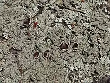This is a list of species in the foliose lichen genus Xanthoparmelia. It is the most speciose lichen genus,[1] containing an estimated 822 species as of 2020.[2] The key characteristics of Xanthoparmelia include the cell walls containing Xanthoparmelia-type lichenan, the pored epicortex, margins without cilia, simple rhizines, small, ellipsoidal spores and bifusiform or rarely weakly fusiform or bacilliform conidia.[3]