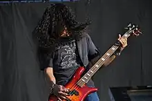 The following is a list of notable electric bass guitar players. The bass guitar is a stringed instrument played primarily with the fingers (either by plucking, slapping, popping, or tapping) or using a pick. Since the 1950s, the electric bass guitar has largely replaced the double bass in popular music. Bass guitarists provide the low-pitched basslines and bass runs in many different styles of music ranging from rock and metal to blues and jazz. Bassists also use the bass guitar as a soloing instrument in jazz, fusion, Latin, funk, and in some rock styles. Musicians known mainly as guitarists are listed separately in the list of guitarists.