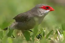 The estrildid finches are small passerine birds of the Old World tropics and Australasia. They are gregarious and often colonial seed eaters with short thick but pointed bills. They are all similar in structure and habits, but have wide variation in plumage colours and patterns.