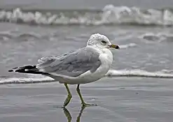 Gulls are typically medium to large birds, usually gray or white, often with black markings on the head or wings. They have stout, stout, longish bills and webbed feet. The large species take up to four years to attain full adult plumage, but two years is typical for small gulls. Terns are in general medium to large birds, typically with gray or white plumage, often with black markings on the head. They have longish bills and webbed feet. They are lighter bodied and more streamlined than gulls and look elegant in flight with long tails and long narrow wings. Skimmers are tropical and subtropical species. They have an elongated lower mandible. They feed by flying low over the water surface with the lower mandible skimming the water for small fish. Thirty-four species have been recorded in Virginia.