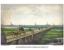 Up until the 19th century, the Unterelbe had no fixed crossing. Travel time between Hamburg and Harburg took over two hours, and included two ferry trips across the Norder- and Süderelbe and a weary trip across the dikes of Wilhelmsburg. During Napoleon's brief annexion of Hamburg, a 4 kilometers (2.5 miles) long pile bridge was built across the islands of Wilhelmsburg, however it also required cable ferries across the Elbe's two anabranches. In 1817 the poorly maintained structure was washed away.