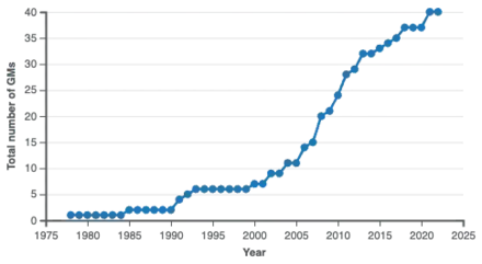 The following chart illustrates the total number of female grandmasters by year based on the date when each player achieved the GM title (the title date).