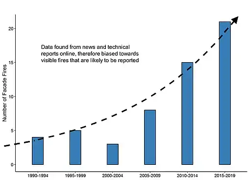 Plot showing the number of large façade fires worldwide every five years from 1990 to November 2019. Data found from news articles and online.[83][84]