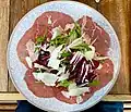 Italy | Raw meat (such as beef, veal, venison, salmon, or tuna), thinly sliced or pounded thin, and served mainly as an appetizer: Pictured is carpaccio with cheese. |