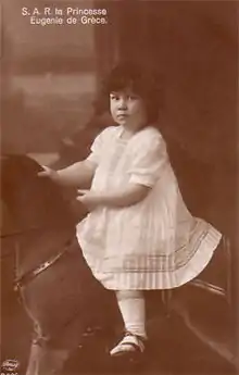 Evgenía | 1910 | 1989 | Great-granddaughter of Christian IX and Louise of Hesse-Kassel | Also a princess of Greece by birth. First Marriage Dominik Rainer Radziwiłł on 30 May 1938, divorced in 1946. Second Marriage Raimundo, 2nd Duke of Castel Duino on 28 November 1949, divorced in 1965. |