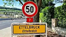 In Luxembourg, villages and towns are signposted by bilingual yellow streetsigns showing the official name (often in French) and the luxembourgish name of the locality.
