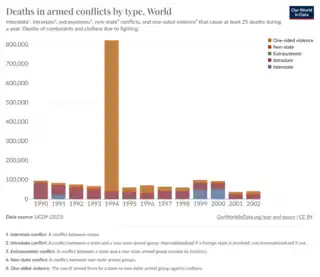 Graph of conflict deaths from 1990 to 2002. The spike of one-sided violence in 1994 is mostly due to the Rwandan genocide.