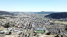 Lithgow is on the Great Western Highway, about 150 km (95 mi) west of Sydney,[3] or via the old mountain route, Bells Line of Road, from Windsor. At June 2021 Lithgow had an urban population of 11,197.[1] Lithgow is surrounded by a varied landscape characterised by seven valleys which include national parks, one of which, the Blue Mountains National Park, is a World Heritage Area. The Wollemi National Park is home to the Jurassic-age tree the Wollemi Pine, which was found growing in a remote canyon in the park.[4]