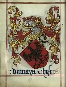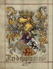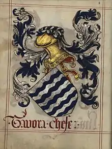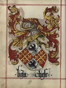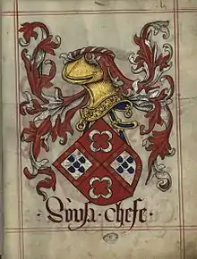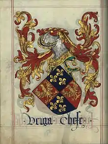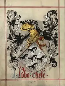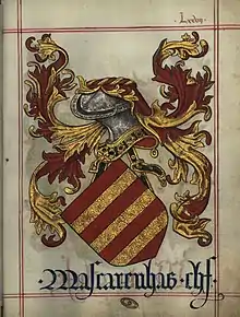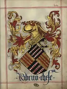 Several models of mantlings have been identified in the work, and seven models of mantling, three of which adorn 190 of the arms, and the remaining four only 24.[6] As for the helmets that top the shields, there seem to be no criteria, in the case of noble Houses, regarding the use of gold helmets (34 cases) and silver helmets. "...only one explanation remains. The illuminator did not respect any rule in choosing the metals or colors and the shape of the elements outside the shield. The choices were based solely on artistic criteria, due to the inspiration and creativity of the artist."[7] As the same author mentions, this was relatively common in armorials of the time.