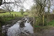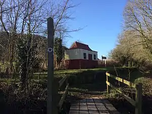 The branch was incorporated into the Great Western Railway at the Grouping of 1923, passing on to the Western Region of British Railways on nationalisation in 1948. Passenger services were discontinued in 1951, general freight in 1963 and milk traffic from near Felin Fach ceased in 1973.[2] The halt had a single platform and the line nearby was placed in cuttings to hide the line from the owners of the Llanerchaeron estate. The trackbed here is now a footpath and the platform, nameboard, and pagoda-roofed GWR shelter have been restored.[3]