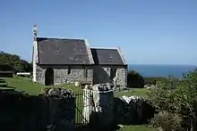 A scattered settlement, it is distinguished by a hillfort known as Din Sylwy or Bwrdd Arthur and by a late medieval church dedicated to St. Michael (Welsh: Mihangel). The hillfort constitutes a relatively flat but partly overgrown area, 600 yards from the Irish Sea. Two entrances have been detected. The small fifteenth-century church consists of a simple nave and chancel and preserves a number of original features.