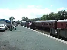 A passenger train arrives at Llynclys South, passing through the Trust's rolling stock, having returned from Penygarreg Lane halt.