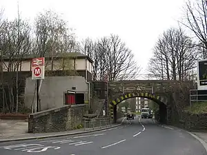 To the south of the station, the line to Sheffield passes over the valley of the River Holme by an impressive 476 yards (435 m) long stone viaduct to Berry Brow. Below the 122 feet (37 m) high structure is the Huddersfield Rugby Union Club ground at Lockwood Park, which was formerly a Bass Brewery. The former Meltham branch line branched off the main line just before the viaduct. This line closed to passengers in 1949 and to freight in 1965. To the north, the route passes through a short tunnel then crosses another large viaduct across the River Colne before joining the main line at Springwood Junction.