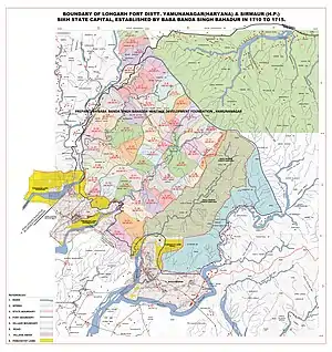 Lohgarh Sahib Fort, the Sikh State Capital, established by Baba Banda Singh Bahadur, is spread in almost 7000 acres and is situated in the old state of Nahan, now in District Yamuna Nagar of Haryana and District Sirmour of Himachal Pradesh. The fort Lohgarh is in the revenue estates of Lohgarh (HP), Haripur (HP), Jhil (HP), Mehtawali (HP), Palori (HP), Sukron (HP),Maharonwala (HP), Bhagwanpur Nathauri (Haryana), Dhanaura (Haryana), Nagli (Haryana) and Mohindinpur (Haryana). The circumference of the fort about 30 km. Archaeological evidence and engineering formulas (time and motion study) depicts that, it took almost 70 to 80 years for making fortifications in such a huge area.
