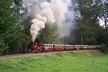 Established in 1965 and expanded in 1976, this 15 in (381 mm) gauge ridable miniature railway is among the busiest in the country. It has a length of one and a quarter miles (2 km) through scenic woodland and along the edge of Half Mile Lake. The line has taken several different courses across the years, but the route along the lake has remained consistent. After opening the railway was originally run by outside company Minirail on a ten-year contract, which was not renewed due to disagreements between the two companies. Following this, Longleat took over running the railway in 1976. Many engines have run on the railway over the years, both steam and diesel; as of 2018 the railway owns three diesel locomotives. The railway also has 15 carriages, all built at Longleat between 1976 and 2013 and wearing mock British Railways crimson and cream livery, along with several permanent way wagons. Between 2011 and 2017 the railway was known as the Jungle Express, with the station and carriages given additional theming.[15][16][17]