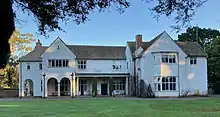 By 1921 much of the house had been remodelled with a Lutyens-inspired exterior and neo-Georgian revival interior.[2] This enlarged it to 14,000 square feet and gave it its present appearance: "a competent essay of English elegance".[1][3] With over 40 rooms, including 16 bedrooms, the house was situated amongst large formal gardens and approached via a long driveway through a grove of mature trees. New polo stables and garaging for five cars was constructed behind the house in 1923: all the cars were Daimlers until the 1950s, Chryslers afterwards.[2] The grounds contained formal flower gardens, a lily pond fed by a water race, and a sunken garden inspired by one at Hampton Court and decorated with statues representing the four seasons.[2] A nearby greenhouse built in 1923 was heated by a boiler to grow table grapes, lettuces, and flowers over winter.