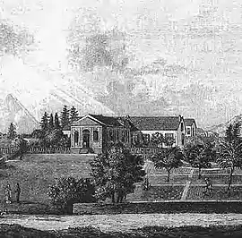 Longwood "was originally a farm belonging to the East India Company and was afterwards given as a country residence to the Deputy-Governor."[1] It was converted for the use of Napoleon in 1815. The British government eventually recognized its inadequacy as a home for the former emperor and his entourage and, by the time of his death, had built a new house for him nearby, which he never occupied. In February 1818, Governor Sir Hudson Lowe proposed to Lord Bathurst to move Napoleon to Rosemary Hall, a house that became available and was located in a more hospitable part of the island, sheltered from the winds and shaded, as Napoleon had preferred.[2] But the revelations of General Gourgaud in London brought Lord Bathurst to the opinion that it was safer to keep Napoleon at Longwood, where an escape was harder to undertake. The building of the new house only began in October 1818, three years after Napoleon's arrival on the island.