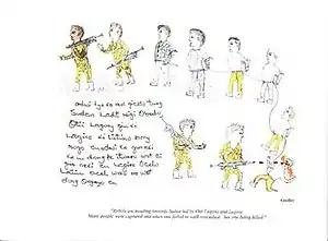 Furthermore, the LRA no longer had to spend much of its energies in the search for basic supplies now that they were supported by Sudan.[6] The moral rationale was that since the Acholi adults had proven themselves untrustworthy, the LRA must cleanse the land of them and create a new society with the children. This philosophical approach, similar to that taken by the Khmer Rouge of Cambodia, has been referred to as "auto-genocide."[7]