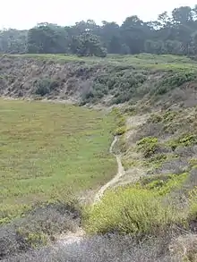 The official name of this trail is simply Marsh Trail.[53] It is unpaved on its west end and paved on its east end. It is shown on Google maps. Dogs and bicycles are prohibited. It skirts the southern edge of the wetland for 1.5 miles from North Torrey Pines Road and becomes Flintkote Avenue in Sorrento Valley, San Diego. The trailhead is across from the South Beach parking lot at Torrey Pines State Beach.