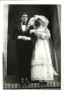 One member of this group even adopted Topo as his stage name. He later specialised in 'robotics' miming mechanical robots. Together with Jimini Hignett he formed his own fringe company 'Christians from Outer Space' performing satirical theatre together, and on July 29, 1981 (the same day as Prince Charles and Lady Diana) they were married - he dressed as Diana, Jimini as Charles. At the wedding - dubbed ‘The Royal Drag’ by the Soho News - all guests are also cross-dressed (the Queen Mum sporting an enormous hairy back and a hat made from pizza boxes). The preacher at first refuses to conduct the ceremony, thinking they were both men. The event is shown on the Channel 7 TV-news.