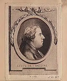 Louis-Florent, chevalier de Vallière, was governor of Saint-Domingue from October 1772 until his death on 10 April 1775.[3] Vallière and the new intendant Jean-François Vincent de Montarcher replaced the outgoing governor Pierre Gédéon de Nolivos and intendant Alexandre-Jaques de Bongars.[4] Nolivos had left on 10 February 1770, and was replaced as interim governor by De la Ferronnays on 15 January 1772.[5]