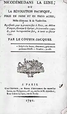 • Nicodème dans la lune, ou la Révolution pacifique, folie en prose et en 3 actes, mêlée d'ariettes et de vaudevilles. Paris, Théâtre-Français, 7 November 1790. Reprinting: Nizet, Paris, 1983. Text online