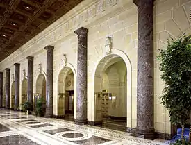 By mid-1927, Ayres was proposing a grandiose building to anchor the western end of Federal Triangle. The proposed building had 1,605,066 square feet (149,115.5 m2) of interior space (more than 60 percent larger than originally planned).[41] The structure was essentially rectangular, with seven wings and six interior courtyards that was one city block wide and three blocks long.[42] There were 15 entrances and 16 interior stairways.[42] Its seven stories were clad in granite and limestone.[42] More than 8 miles (13 km) of corridors accessed 37 acres (15 ha) of office space designed to house 10,000 workers, accommodate 8 million patents in a publicly accessible manner, include a public aquarium with 40 tanks and 2,000 fish, and house a 200,000-item library.[42] Ayres asked James Earle Fraser (sculptor), a sculptor and colleague on the Commission of Fine Arts, to design and sculpt the various external features of the building.[35] At first Fraser said he had far too many other commissions and could not work on the Commerce building, but Ayres and Fraser developed a cooperative work style that eventually was adopted for most of the buildings in the Federal Triangle: Fraser consulted with Ayres and other architects to develop appropriate themes and content and then built or fashioned models of his designs.[35] Then his assistants enlarged the models into full-scale sculptures and did the physical work of actually carving the art.[35] Ayres designed four massive pediments for the building, which Fraser filled with sculptures with the themes "Aviation," "Mining," "Fisheries," and "Foreign and Domestic Commerce."[35] Ayres contracted with interior designer Barnet Phillips to design and implement the interior elements of the building.[43] Ayres had planned a main lobby that was Neoclassical in design.[43] Phillips designed rusticated walls, placed arches over every doorway, placed Doric columns throughout the lobby, added a painted and coffered ceiling, and laid terrazzo and marble down for the lobby floor.[43]
