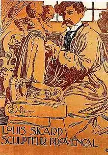It is as a sculptor that Louis Sicard is represented by David Dellepiane on a poster produced for an exhibition he staged in 1906.[A 5] Françoise-Albane Beudon notes of this poster: "Louis Sicard is captured in the clutter of his studio, modeling a water carrier with his fingers.[4] On the wall, some of the pieces he excelled at: tambourines, cicadas and medallions.[4] Captured in the fever of creation, his face is powerfully rendered, with the apple of his eye as black as his lavaliere".[4]