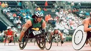 From 1993 to 2001, Sauvage won every IAAF wheelchair demonstration event at IAAF World Athletics Championships.[22] In that same period, she also won the demonstration events for wheelchair racing in the 800 metre race at the Olympic games.[23] The 800 metre event does not require that athletes stay in their lanes after the first turn. For this reason, athletes like Sauvage are required to wear helmets when racing. In 2000, Sauvage won the Olympic demonstration event and was expected to win the Paralympic gold. She was upset by Canadian Chantal Petitclerc.[23] The Australian delegation appealed the result, claiming the race was not fair because another racer, Ireland's Patrice Dockery, was disqualified for leaving her lane too early. The appeal was rejected, because Dockery was too far behind the front runners to impact the results. Sport academics who research the Paralympic Games consider this protest to be pivotal, because it shows the passion of athletes to win and the extent that sports people will go to claim gold. It also highlighted that the rivalries in the sport were real. Petitclerc said of her rivalry with Sauvage that "I dream more about Louise than I do my boyfriend." In 2002, Petitclerc beat Sauvage again at the 2002 Commonwealth Games, where the 800 metre event was a full medal event at the games for the first time. It was only the second time that Sauvage had lost to Petitclerc.[24]