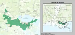 For most of the period from 1983 to 2013, this district contained nearly all of the city of New Orleans (except for a small portion located in the neighboring 1st congressional district), and some of its suburbs. In 2003, it was pushed into the West Bank portion of Jefferson Parish and South Kenner, which have a higher proportion of white residents.[4] After the 2010 census, the legislature pushed the 2nd slightly to the west, picking up a portion of Baton Rouge–essentially, most of the capital's majority-black precincts.
