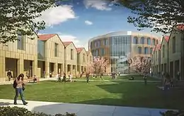 The complex will consist of four buildings surrounding a 14,000 square foot exterior quadrangle lined with covered galleries. The largest building is a four story, 56,000 square foot Rotunda. This building will be used for the Business School administration offices, and academic affairs. The ground floor will have the student’s common area, lobby and café for the Business School and the community along with a Business Disaster Recovery Command Center. The second building is a two-story structure that will be the Undergraduate Pavilion, which will include classrooms, SMART Lab and faculty offices. The third building will be known as the Graduate Pavilion and will have classrooms, study rooms, team rooms and offices for faculty. The second floor of the Undergraduate and Graduate Pavilions will contain departmental offices for Management, Marketing, ISDS, Accounting, Economics and Finance, as well as Ph.D. suites. The fourth building will be the auditorium. This two-story, 12,600 square foot building can seat 300 people and will be used by the Business School and the community. The second floor of the Auditorium will have graduate classrooms and labs. Both Pavilions and the Auditorium will connect through covered archways on the first floor and enclosed walkways on the second floor.